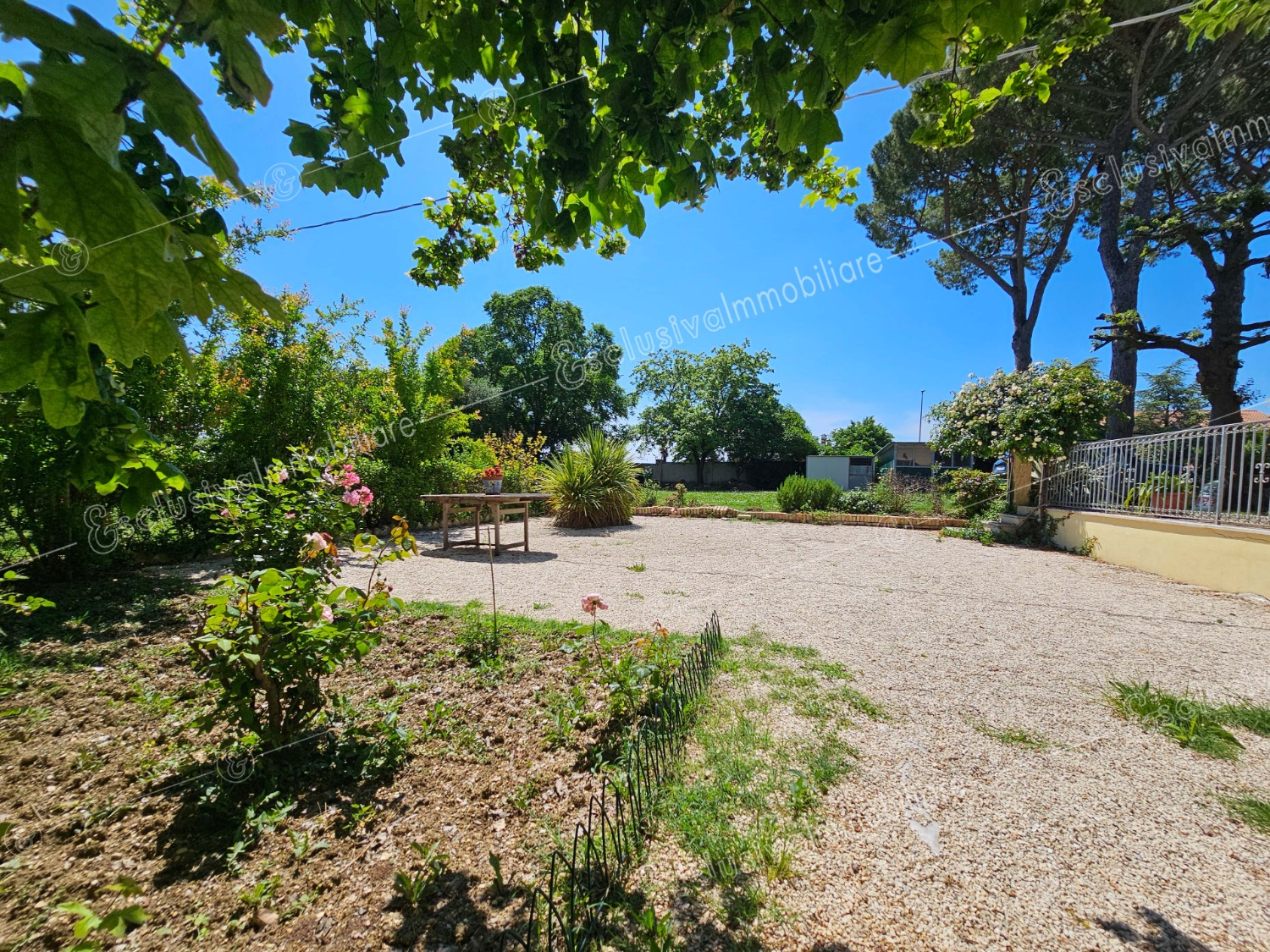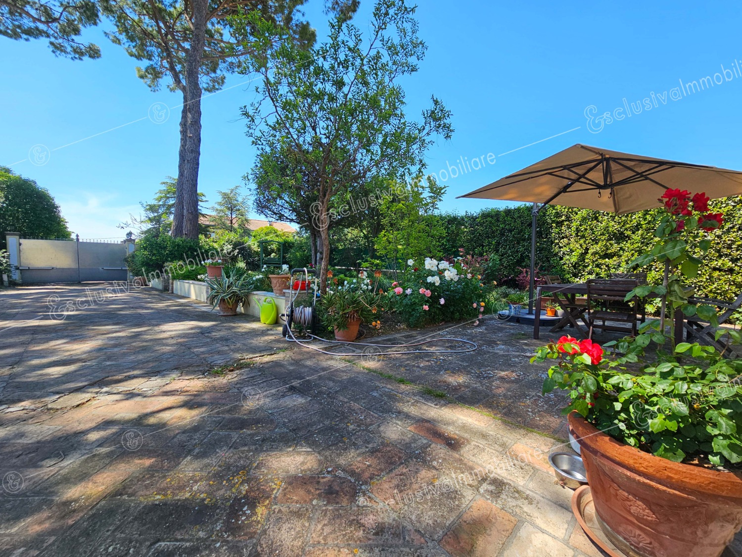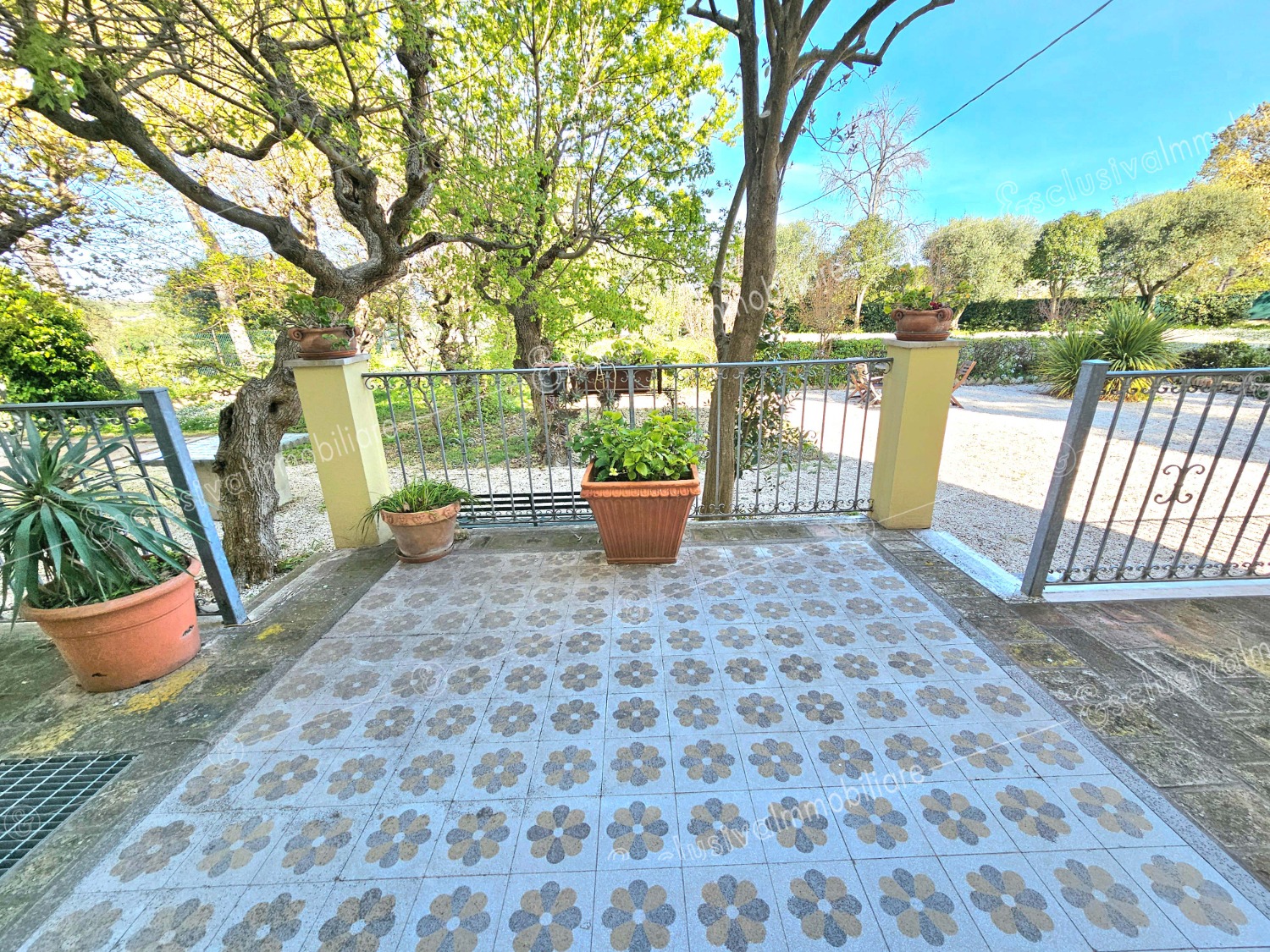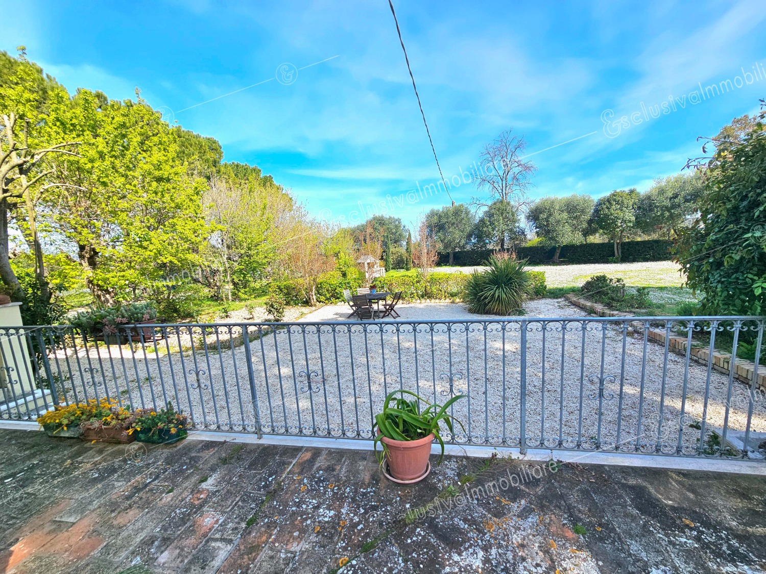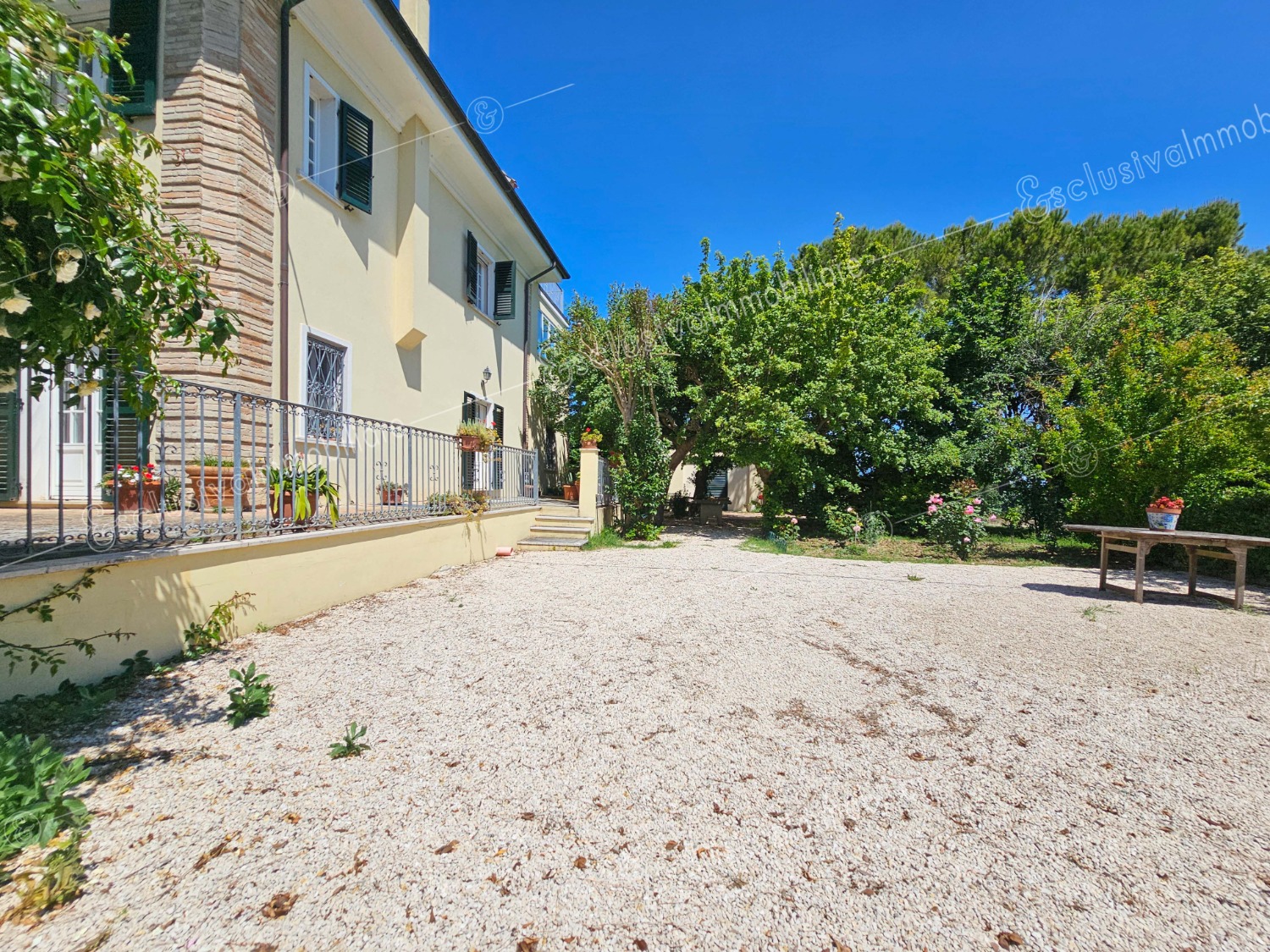 Attraverso un viale privato bordato da pini secolari si apre un mondo riservato e ricco di suggestioni. Un giardino all’inglese di oltre 4.500 mq abbraccia la proprietà, profumato da alberi di limoni, fichi, melograni e da oltre 30 ulivi — alcuni antichissimi — che donano ogni anno un eccellente olio extravergine biologico. Un pergolato in olmo regala ombra e poesia nelle ore estive, mentre un antico pozzo ricorda il passato contadino della tenuta.