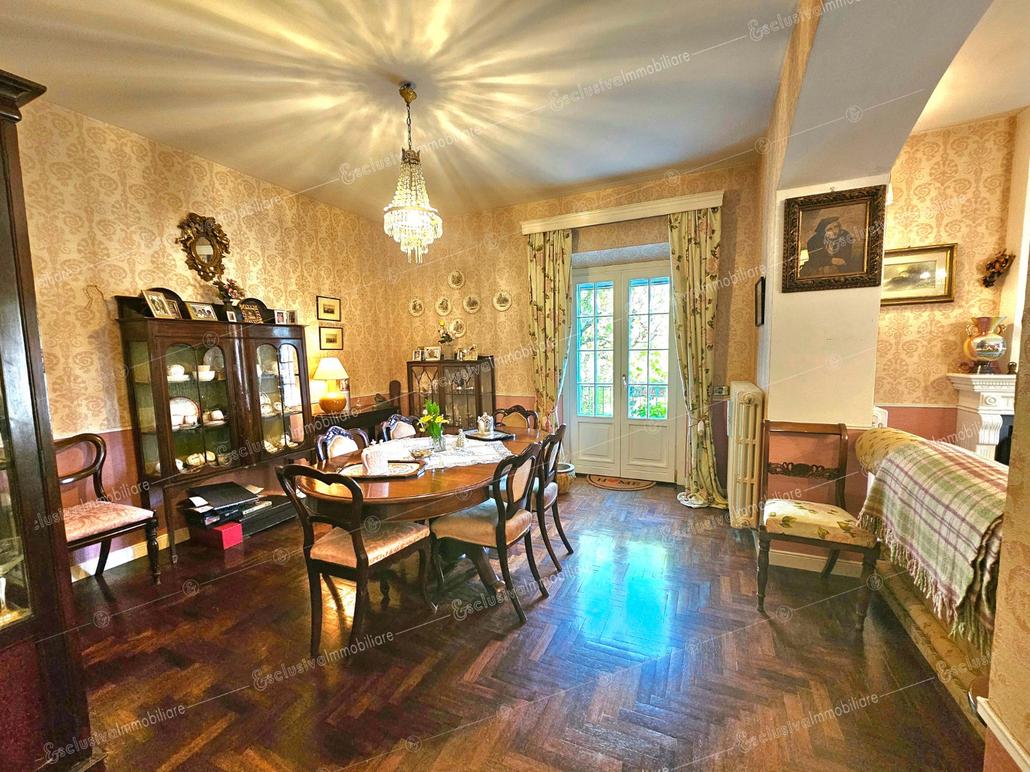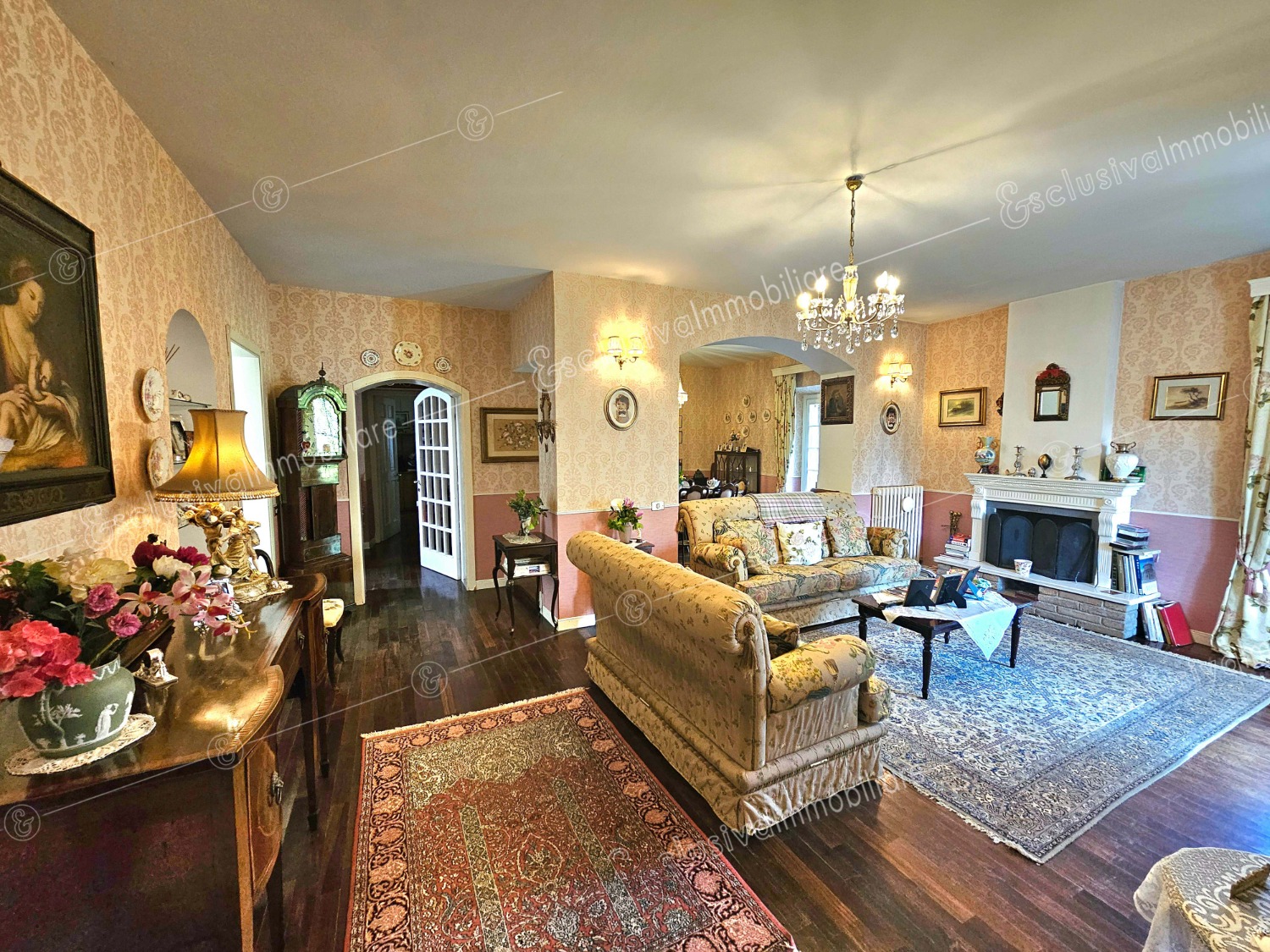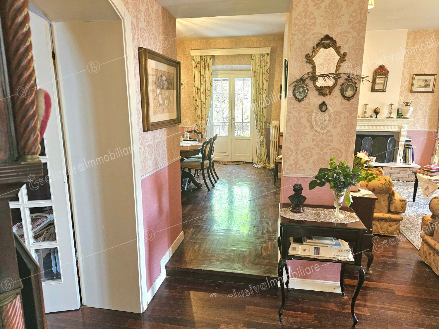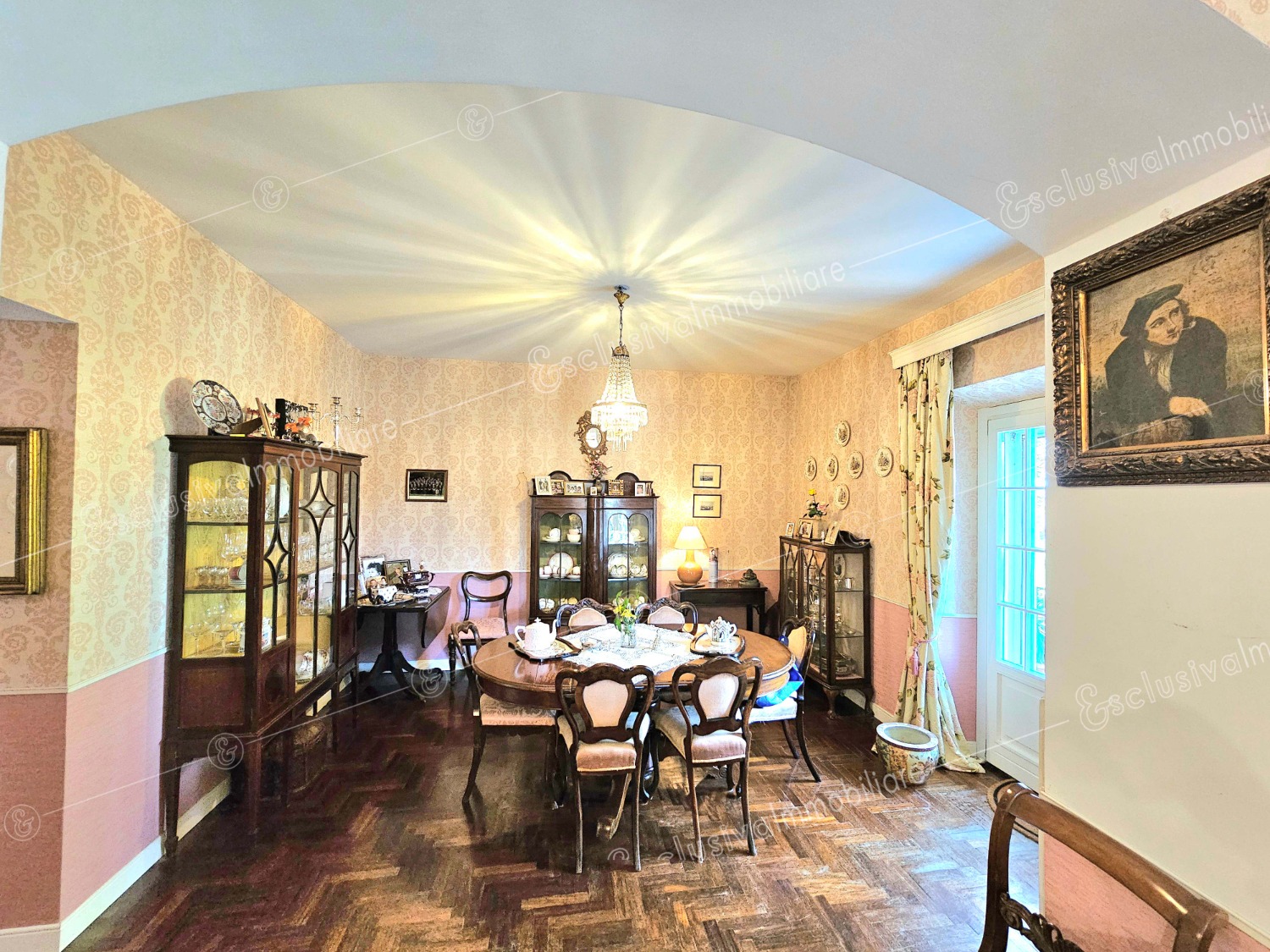 Disposta su tre livelli, con oltre 300 mq abitativi, la villa custodisce spazi raffinati che fondono calore, funzionalità e memoria. Al piano terra, un ingresso signorile conduce al doppio salotto con camino, parquet in legno pregiato e boiserie decorative. Una cucina luminosa con affaccio sul giardino, studio, bagno e lavanderia completano il piano.